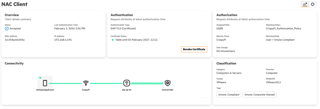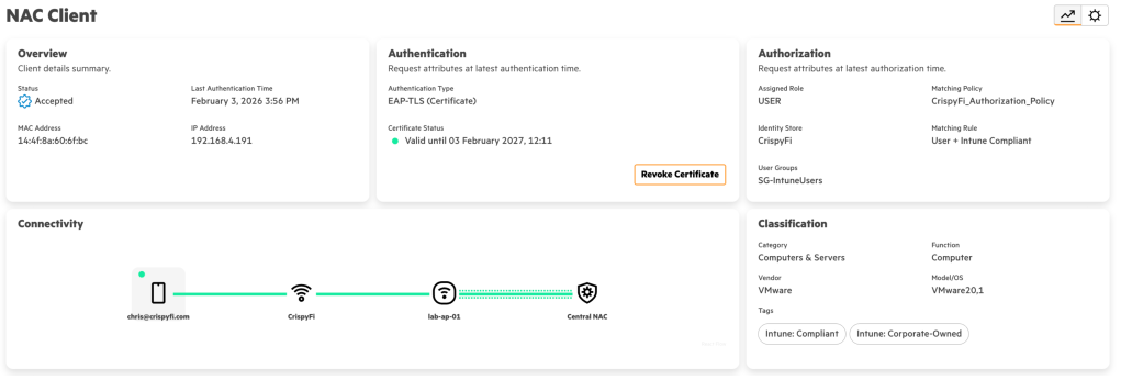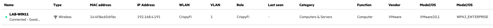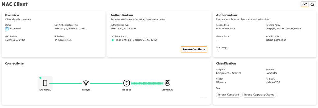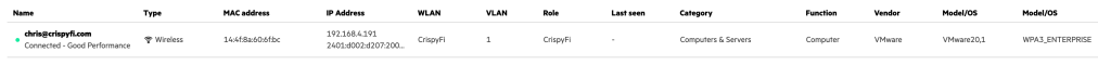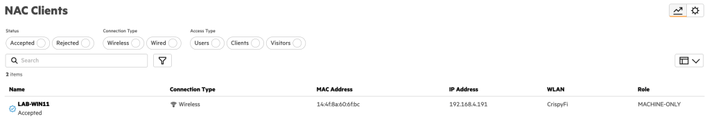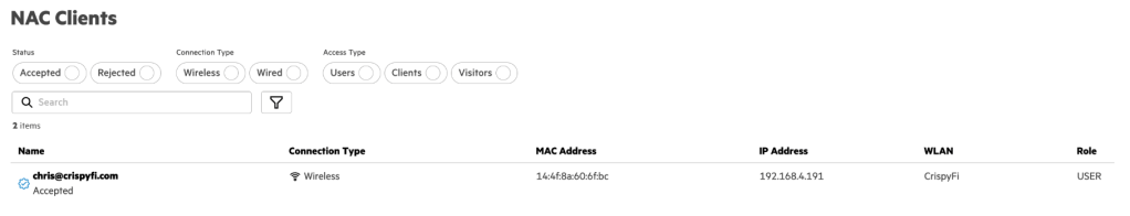 Navigate to Central NAC > Clients to view connections logs, with examples below.