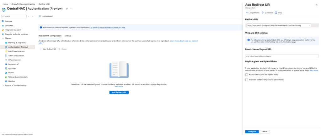 5. Select Web platform, paste the Redirect URI from the Identity Store and click Configure
