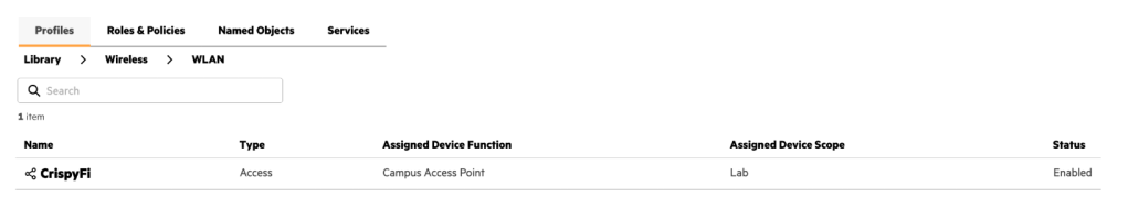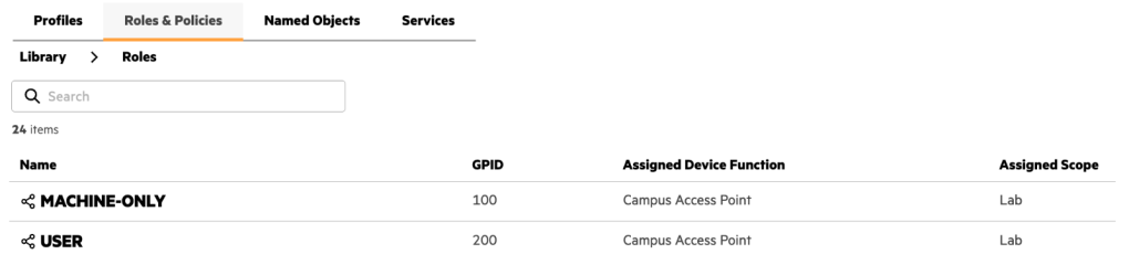 IMPORTANT: Roles and WLANs must be created at the Library level to be visible by Central NAC.