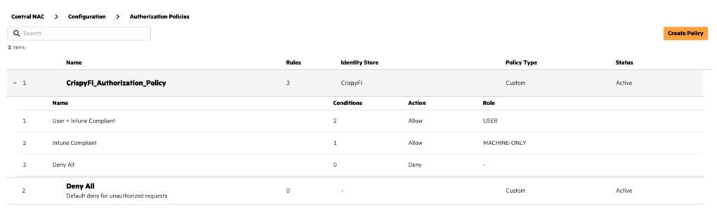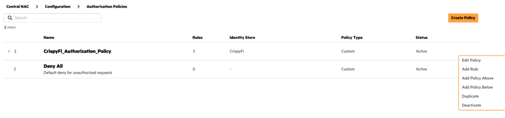 1. Navigate to Central NAC > Configuration > Authorization Policy and click **Create Policy