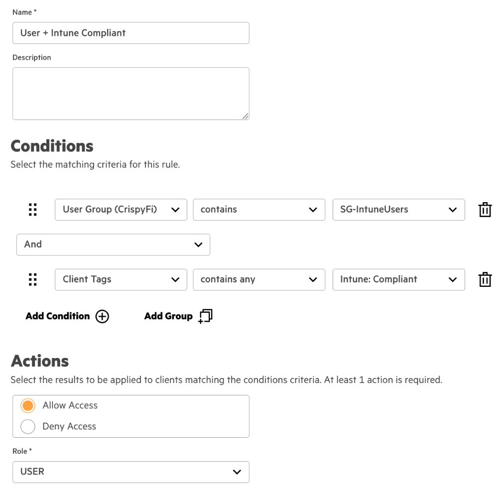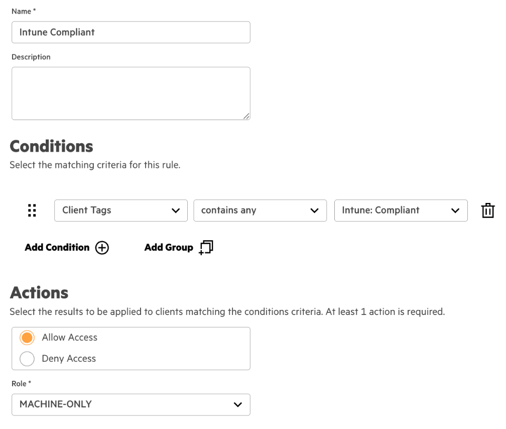 | Conditions | Client Tags contains any Intune: Compliant |