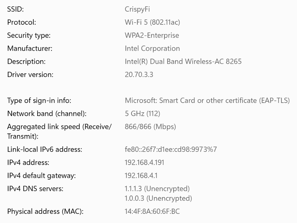 Although Windows is configured with WPA2-Enterprise, it will happily connect to a WPA3-Enterprise network.