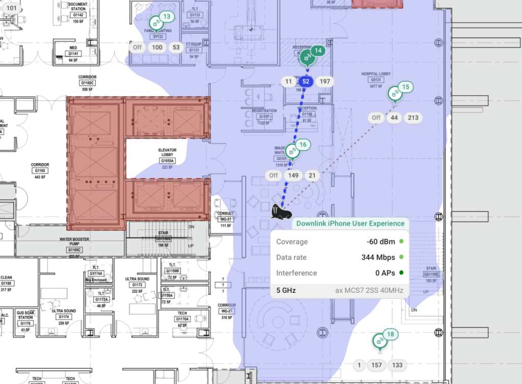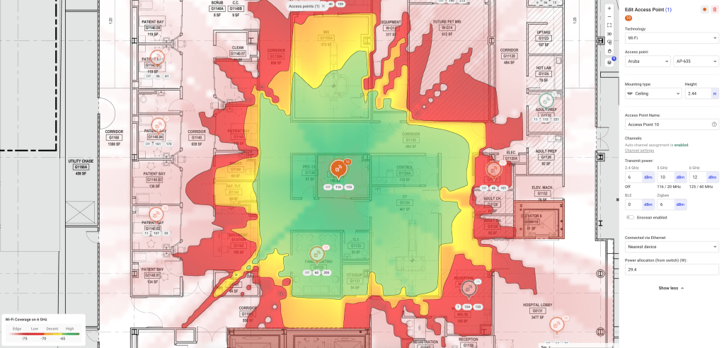 With that in mind, I set to work on a predictive design as I usually would: Importing and scaling a floor plan, defining in-scope vs out-of-scope areas, setting up coverage and capacity requirements, drawing walls and attenuation areas and finally, placing access points.
